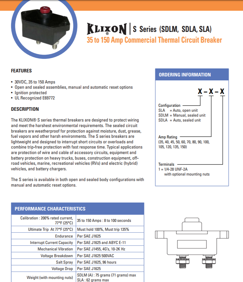 KLIXON@S系列热断路器旨在保护接线,并满足最苛刻的环境要求。密封断路器具有防风雨功能,可防止潮湿、灰尘、油脂、燃油蒸汽和其他恶劣环境。S系列断路器重量轻,设计用于中断短路或过载,并结合无跳闸保护和快速响应时间。典型应用包括重型卡车、公共汽车、建筑设备、越野车、海上、休闲车(RVs)和电动(混合动力)车辆上的附件电路、设备和电池保护的电线和电缆保护,以及电池充电器。S系列有开放式和密封式车身配置,带有手动和自动复位选项。