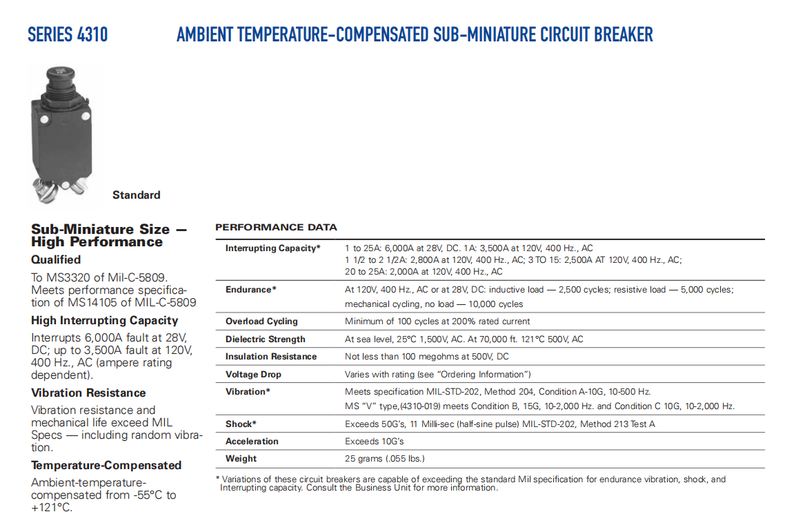 轻质、单相断路器,4310系列,允许高密度包装适用于所有飞机和航空航天需要。