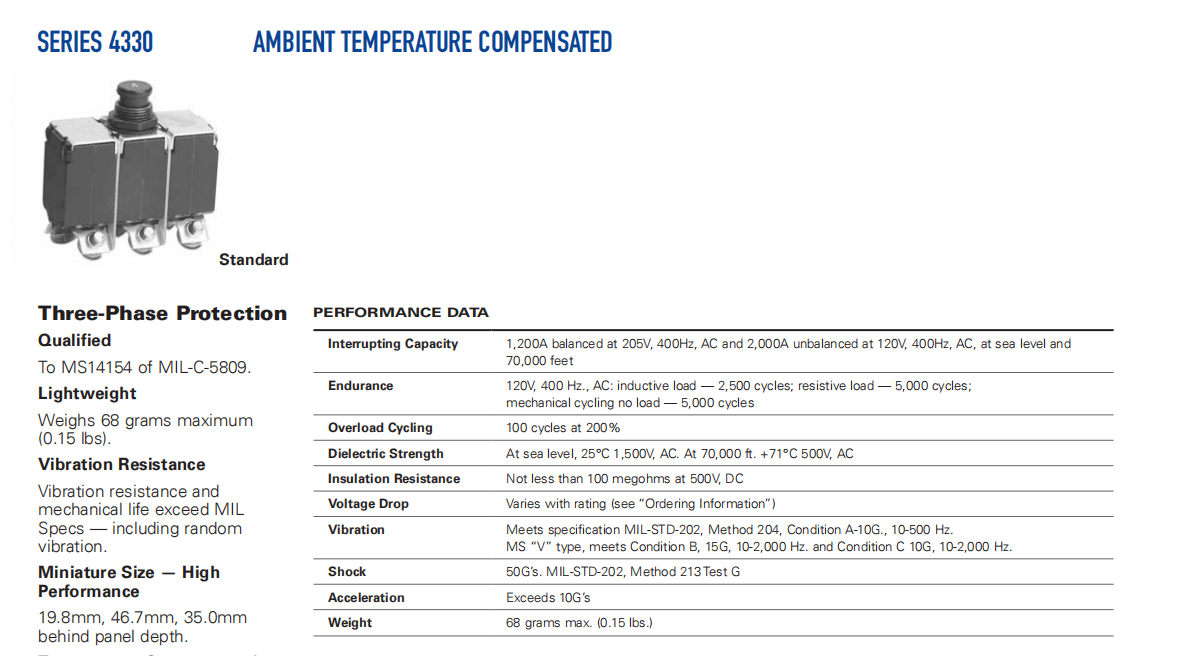 这款轻便、微型、,三相断路器,4330系列,反映了断路器的进展设计,结合自擦拭触点,精密公差