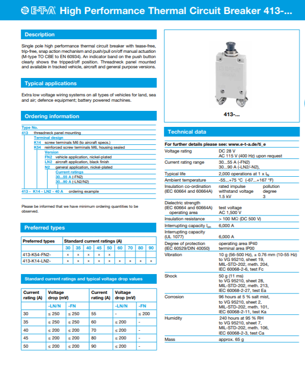 413系列:单极高性能热式断路器,自由脱扣,定点飞入/快速动作机械机构,推(ON)/拔(OFF)式操作方