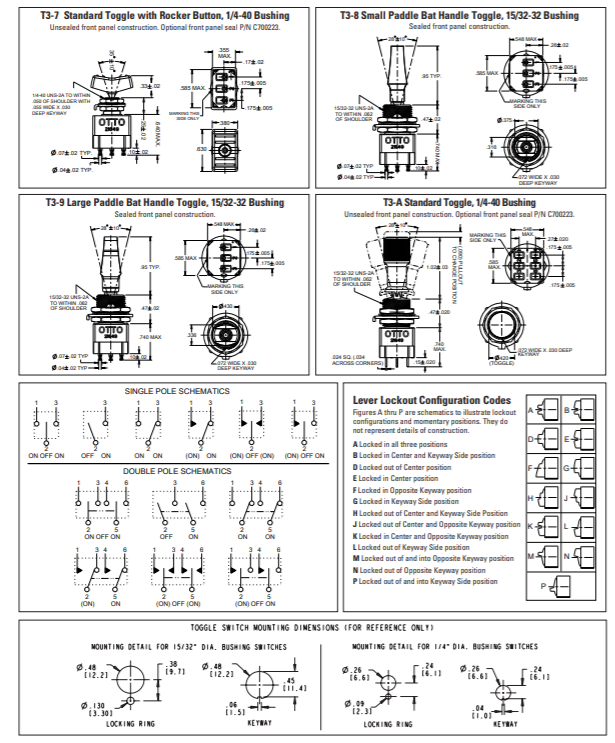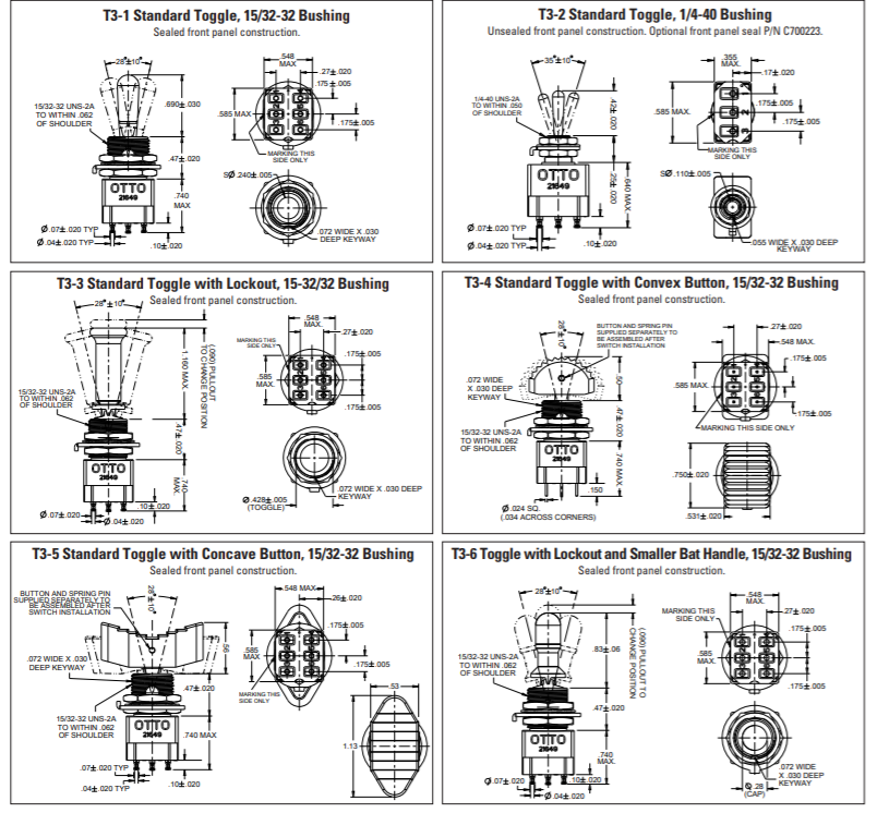 这些微型开关是坚固的,高度可靠的开关提供积极的制动行动,安全的开关操作。T3系列具有独特的奥托速动开关机构和独特的拨动执行机构设计,提供速动触点驱动。奥托设计的高接触压力和卓越的擦拭作用使T3系列成为从逻辑电平切换到5安培负载的绝佳选择。选择密封单极或双极电路,15/32-32密封或1/4-40非密封套管结构,瞬时和/或保持运行。15/32-32衬套型号还提供杠杆锁定拨动功能或拇指按钮执行器。模压端子密封触点,防止湿气和焊剂芯吸。根据MIL-DTL-83731,15/32-32衬套型号的前面板侧密封防水和其他液体。除了MIL-DTL-83731中规定的单转台焊接端子外,我们还提供两种不同长度的针用于印刷电路焊接。提供的安装硬件包括两个六角螺母、一个锁紧垫圈和一个键槽垫圈。