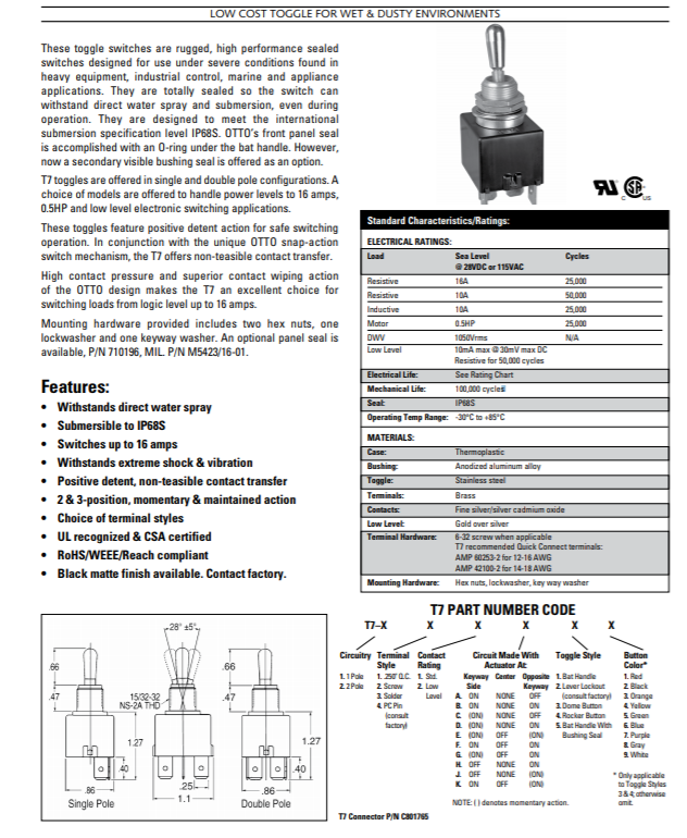 这些拨动开关是坚固耐用的高性能密封开关,设计用于重型设备、工业控制、船舶和电器应用中的恶劣条件。T7系列密封至IP68S和IP69K。OTTO的前面板密封由蝙蝠手柄下的O形圈完成。但是,现在提供了一个辅助可见轴套密封件作为选项。T7开关有单极和双极配置。我们提供多种型号,可处理16安培、0.5马力和低电平电子开关应用。这些开关具有安全开关操作的正止动作用。结合独特的奥托速动开关机制,T7提供了不可剥夺的接触转移。高接触压力和优越的接触擦作用的奥托设计,使T7是一个很好的选择,从逻辑电平开关负载高达16安培。提供的安装硬件包括两个六角螺母、一个锁紧垫圈和一个键槽垫圈。提供可选面板密封件,