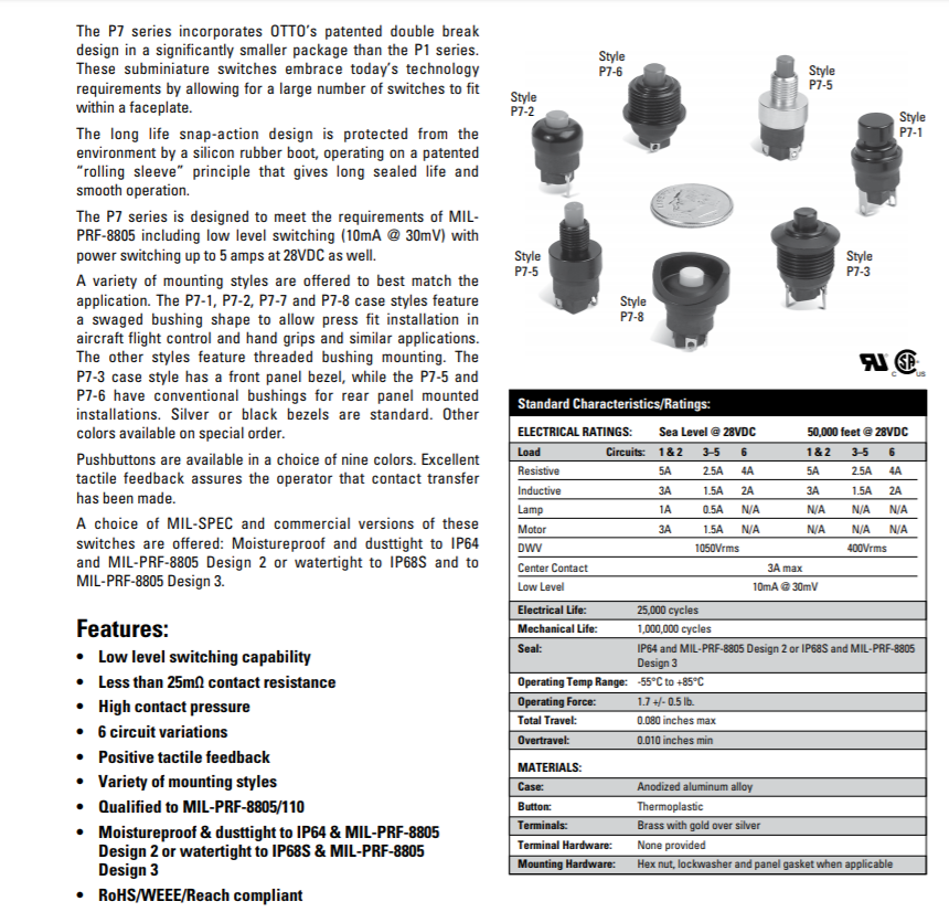 P7系列旨在满足MILPRF-8805的要求包括低电平开关(10mA@30mV)28VDC时的电源切换也高达5安培。